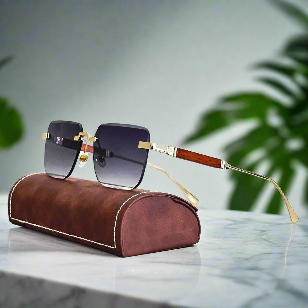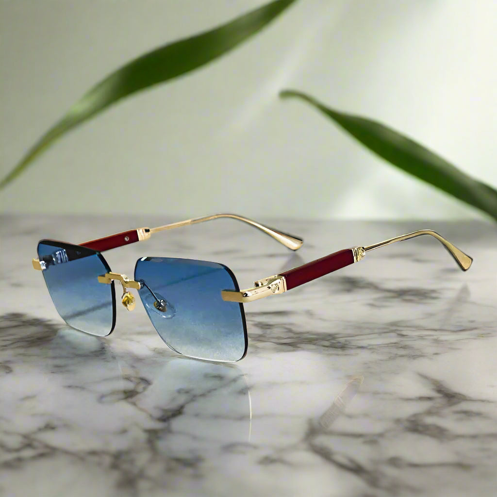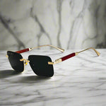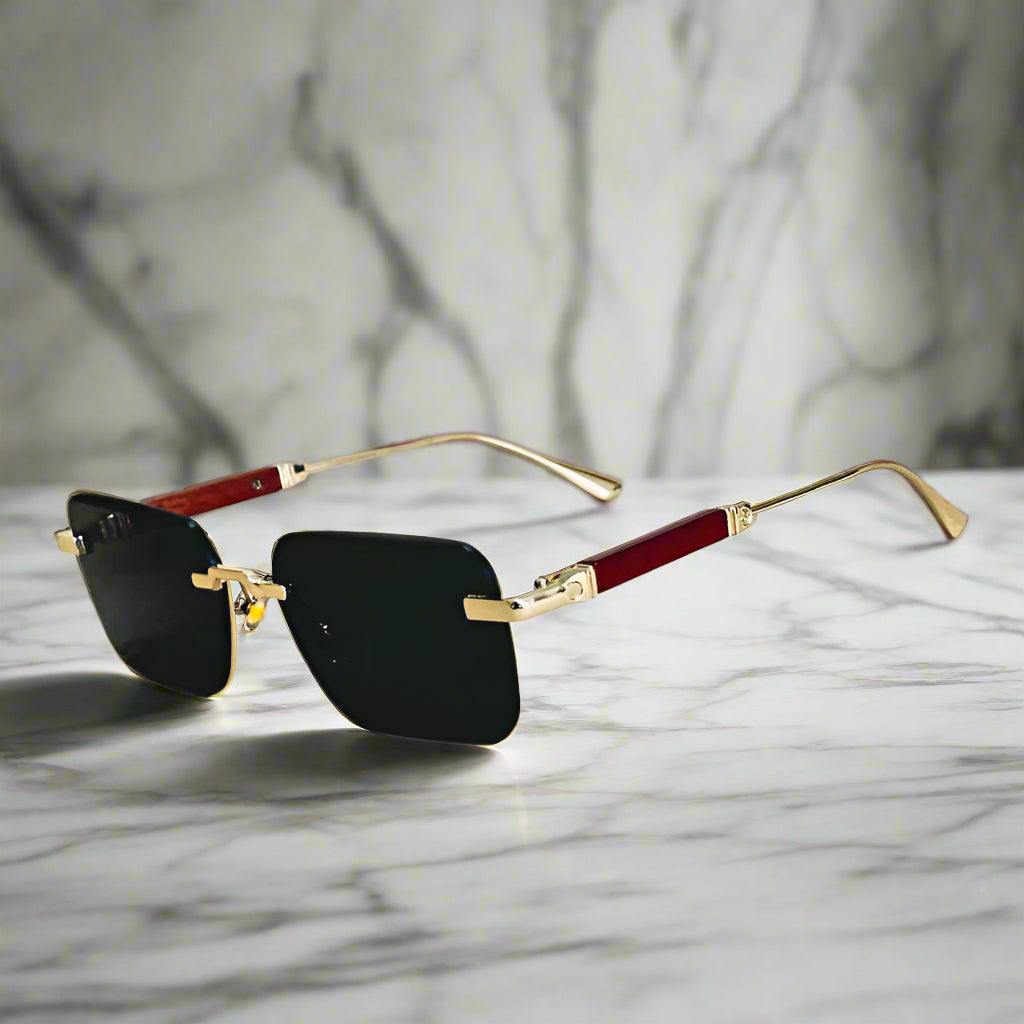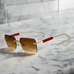 Sada moderních obdélníkových slunečních brýlí s elegantními zlatými detaily a tónovanými skly. Unikátní kombinace barev a materiálů rámu dodává luxusní vzhled, zatímco tvar je lehký a pohodlný. Perfektní pro zvýraznění jakéhokoli oblečení s nádechem elegance.