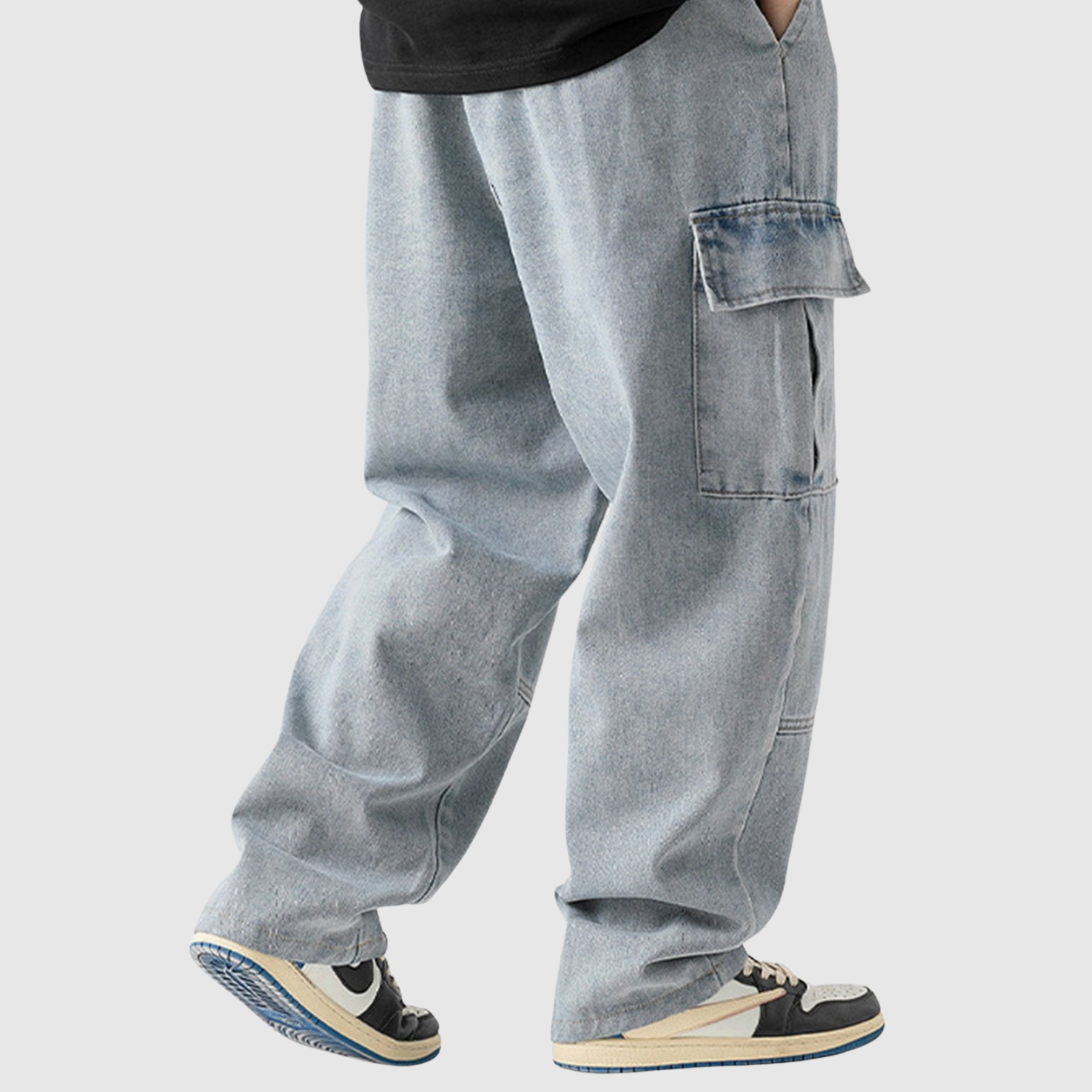 Tyto cargo džíny kombinují praktické detaily s moderním street stylem. Elastický pas a rovné nohavice zajišťují maximální pohodlí, zatímco objemné kapsy přidávají funkčnost a moderní vzhled.
