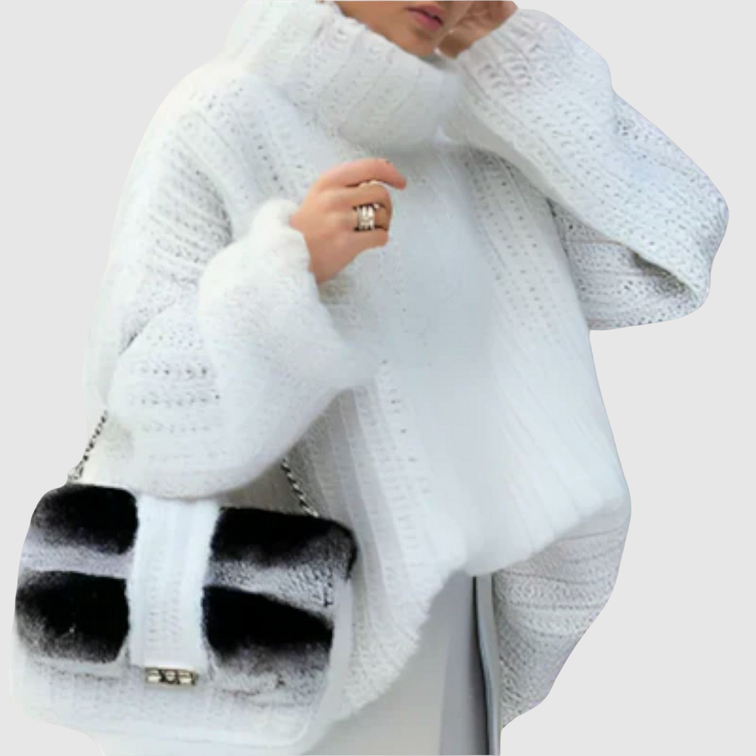 Tento svetřík je vyroben z měkkého a vzdušného materiálu, který poskytuje lehký, ale teplý pocit. Volný silueta a objemný pletený vzor vytvářejí moderní a ženský vzhled, ideální jak pro neformální dny, tak pro elegantní příležitosti.