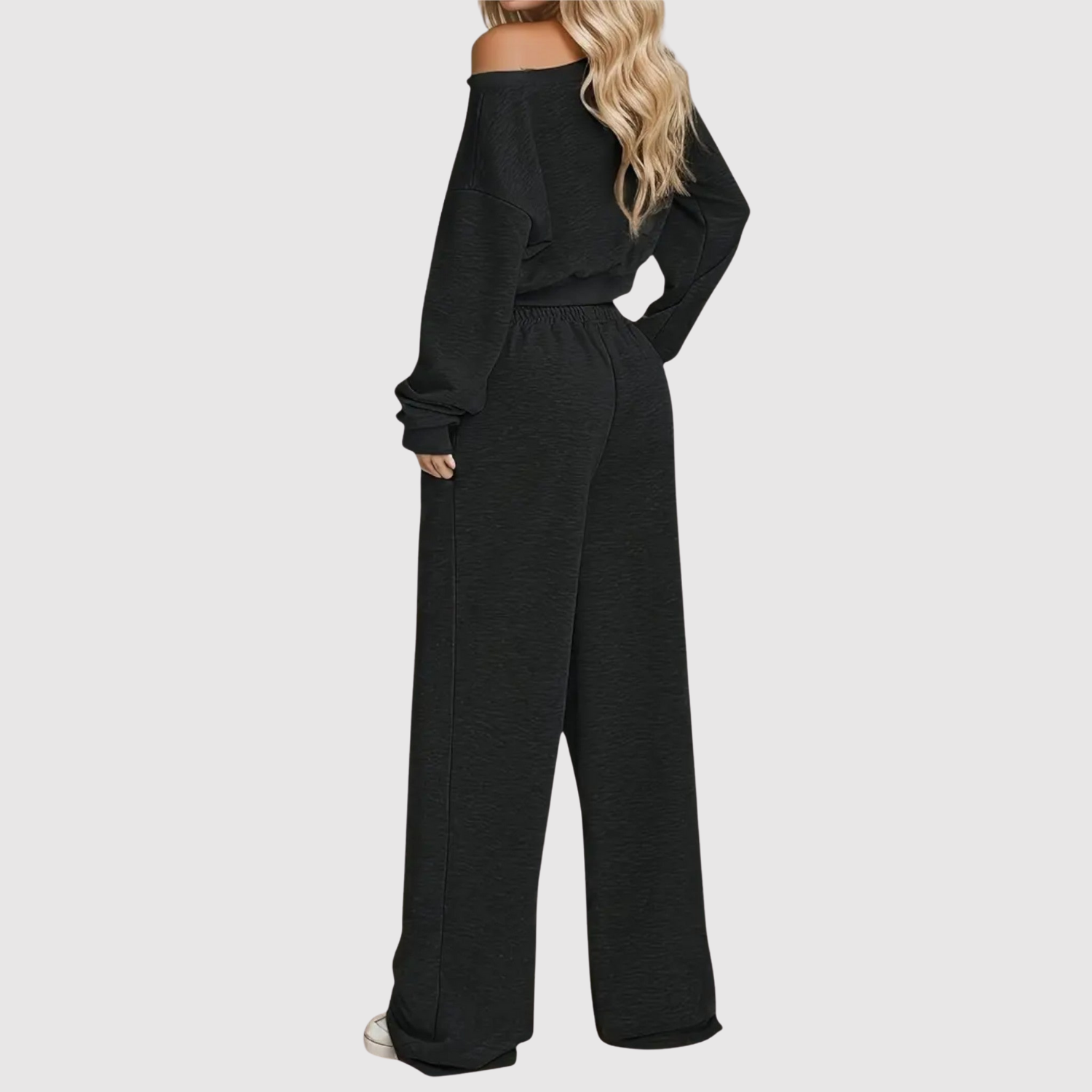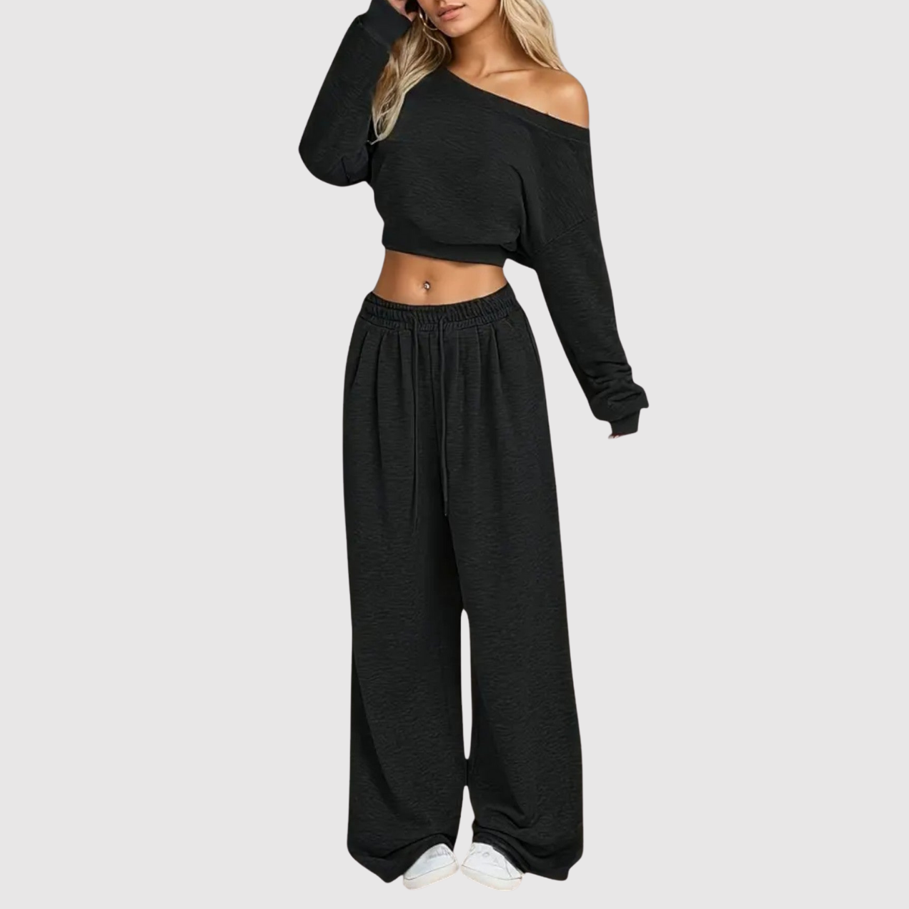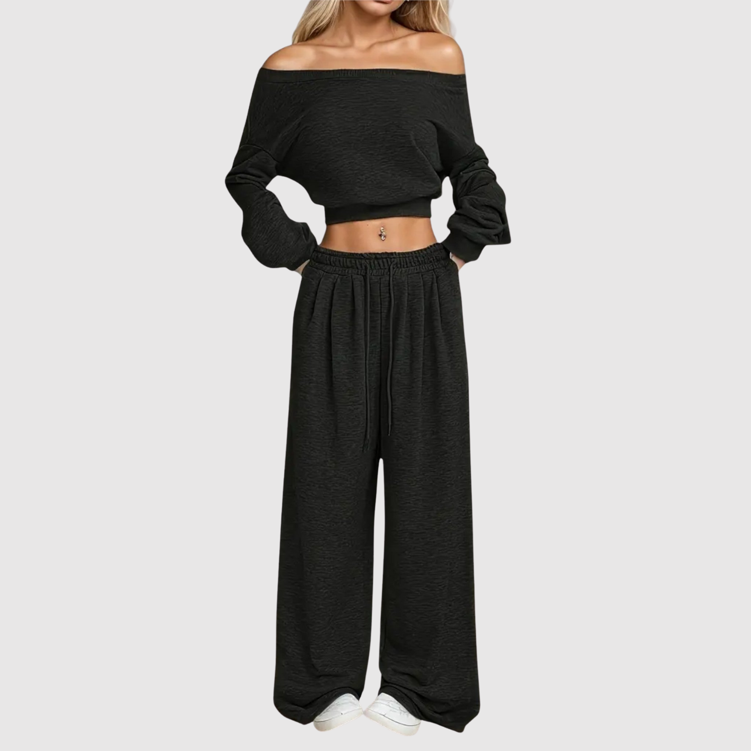 Moderní dvoudílný komplet s horní částí s odhalenými rameny a širokými kalhotami, navržený tak, aby spojoval neformální styl s vytříbenou elegancí. Materiál je lehký a příjemný, což činí komplet ideální jak pro každodenní nošení, tak pro večerní příležitosti.