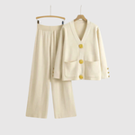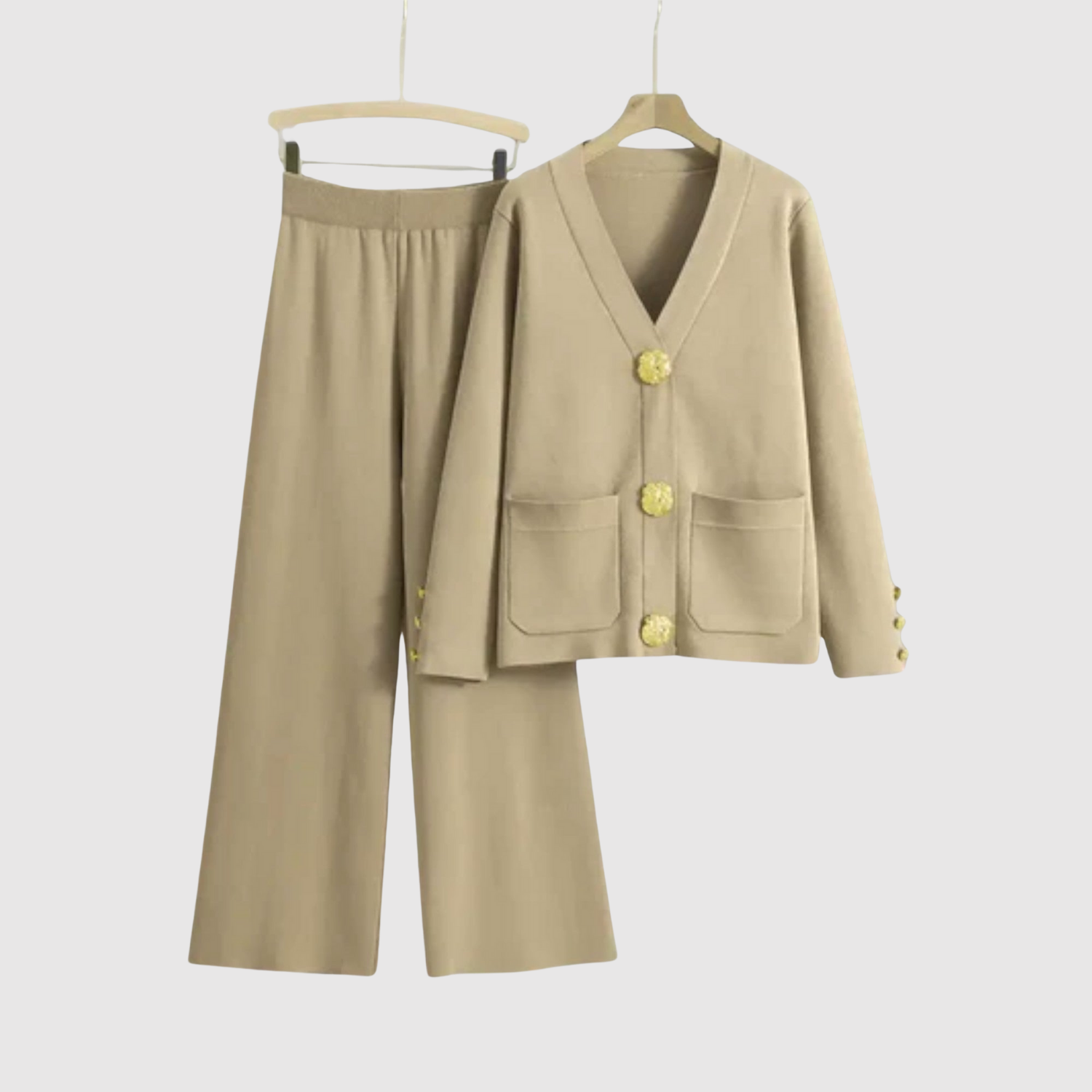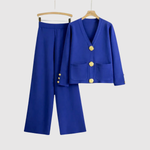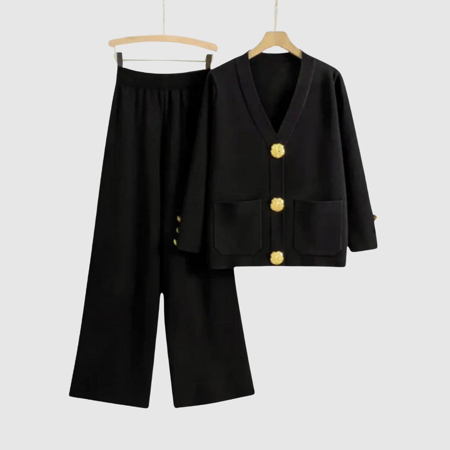 Tato kombinéza spojuje minimalistický design s luxusními detaily. Výrazné zlaté knoflíky dodávají sofistikovaný akcent, zatímco pohodlný střih činí soupravu ideální jak pro kancelář, tak pro večeře venku. Povinný prvek moderního šatníku.