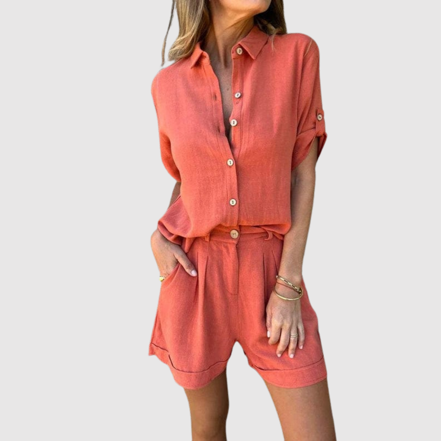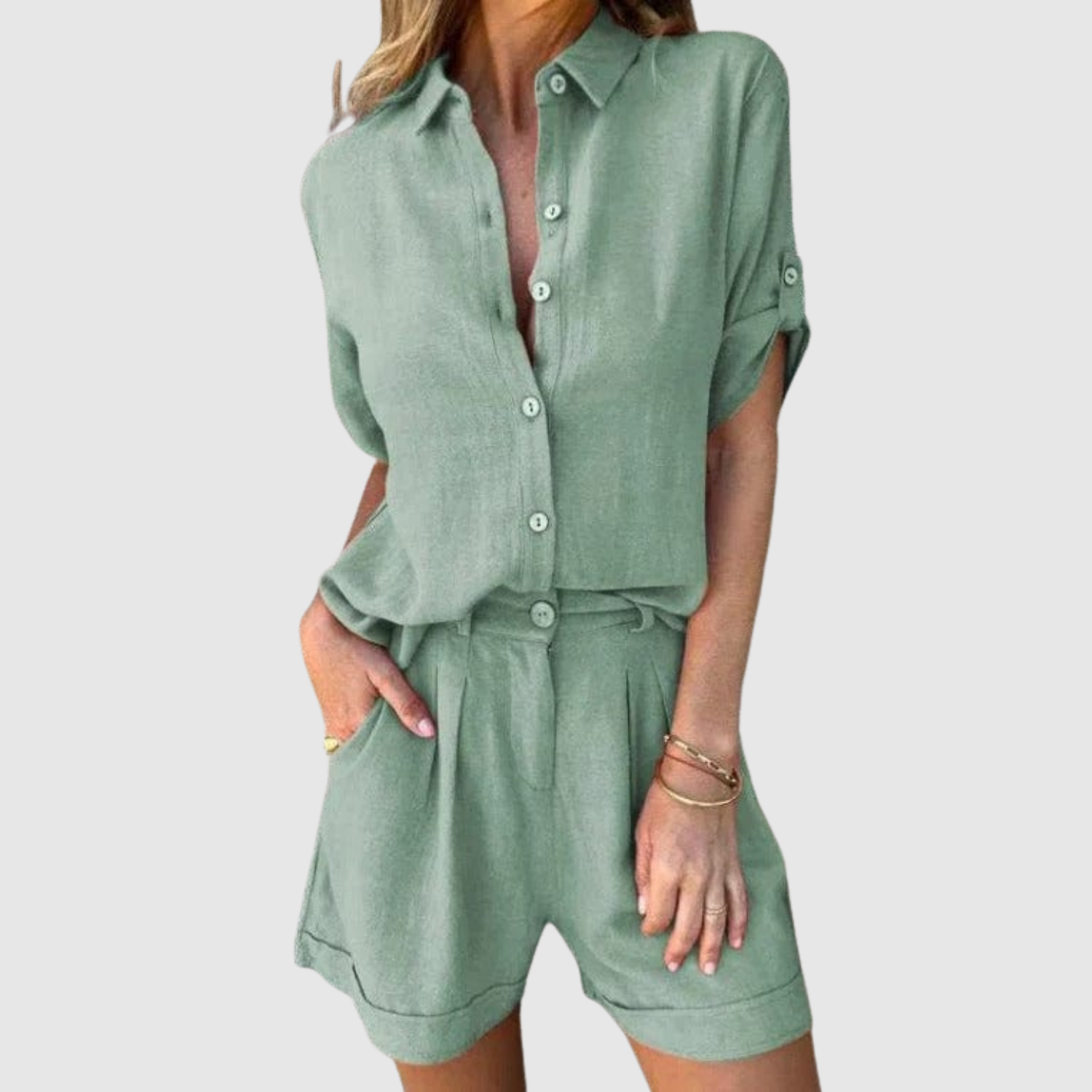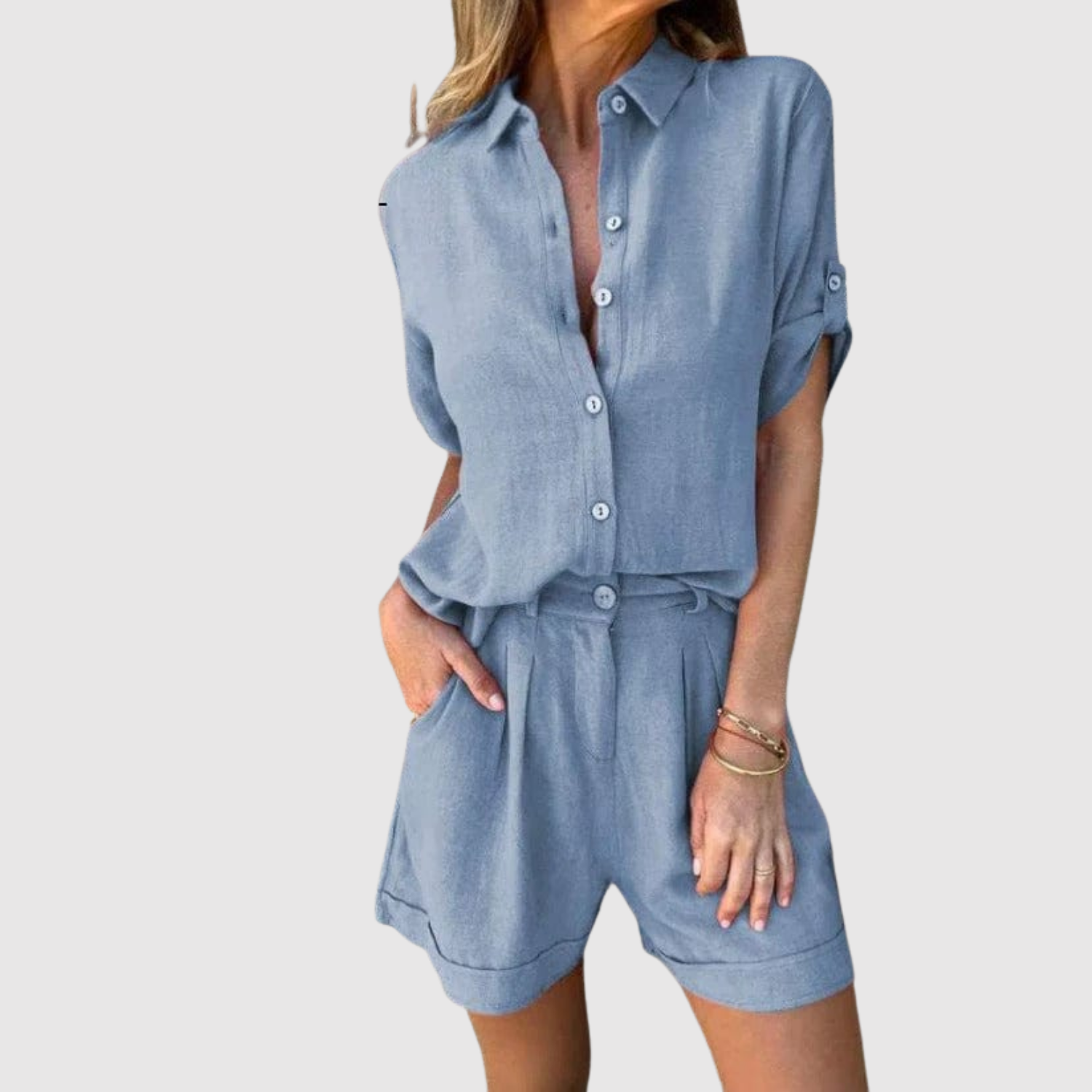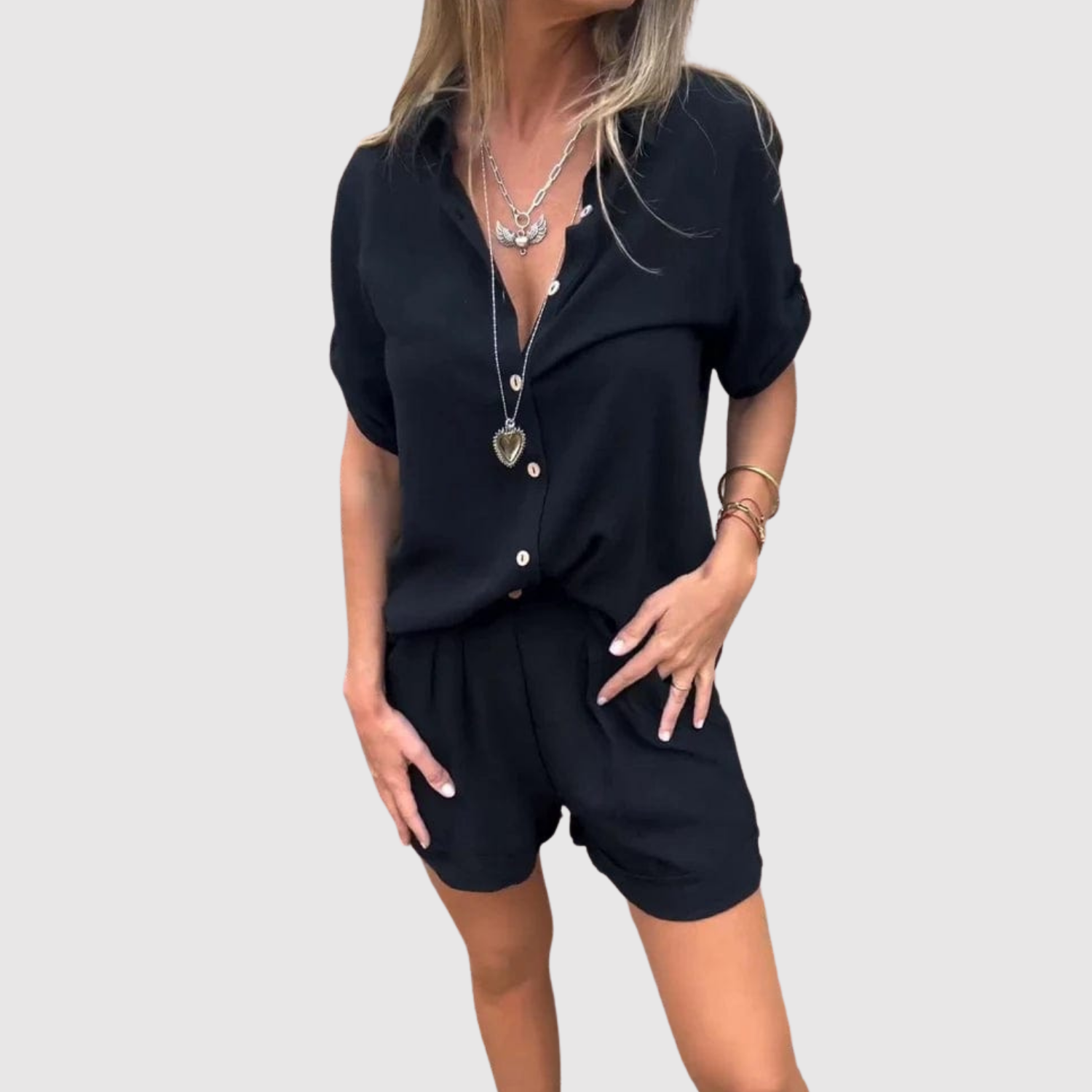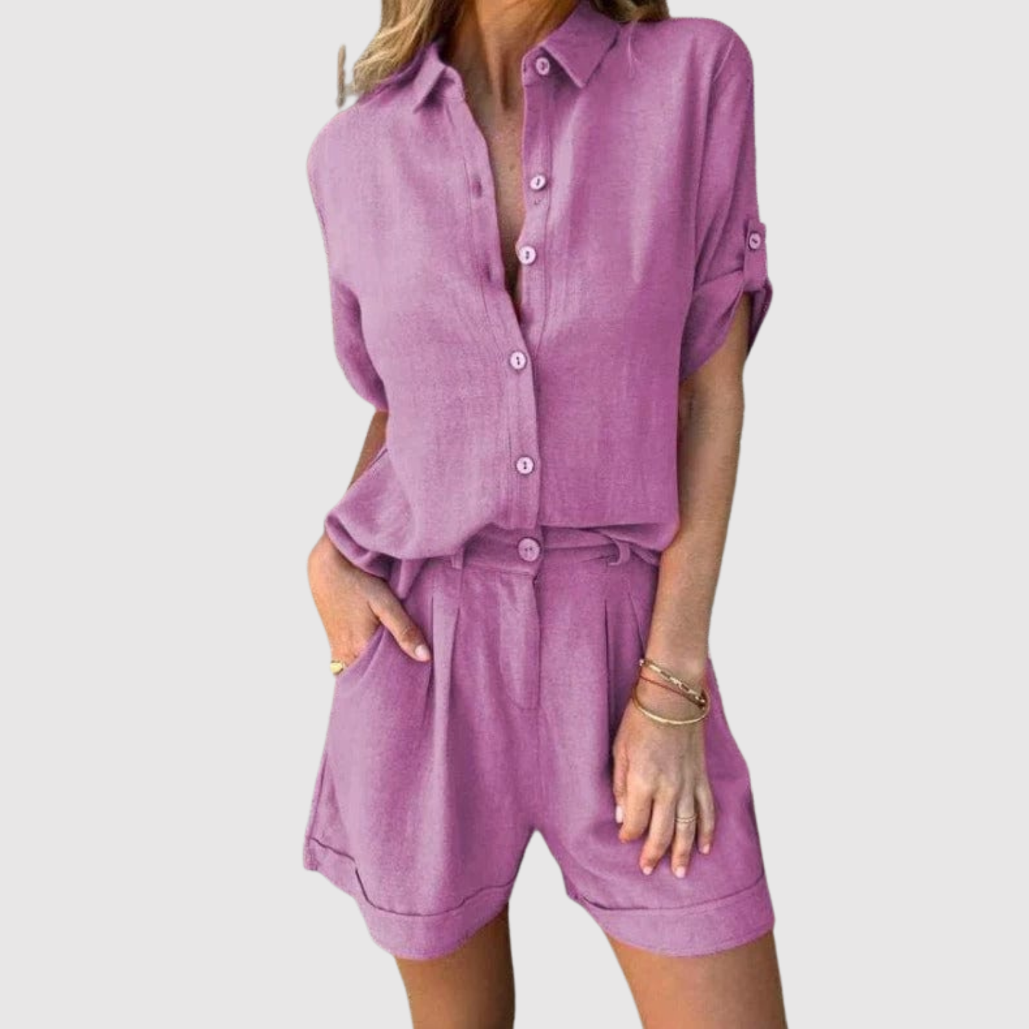Lehký a vzdušný komplet, skládající se z volně stojící košile a odpovídajících šortek. Navržen pro horké dny, kdy komfort a styl jdou ruku v ruce. Perfektní jak na pláž, tak na noční vycházku nebo pro relaxační den doma.