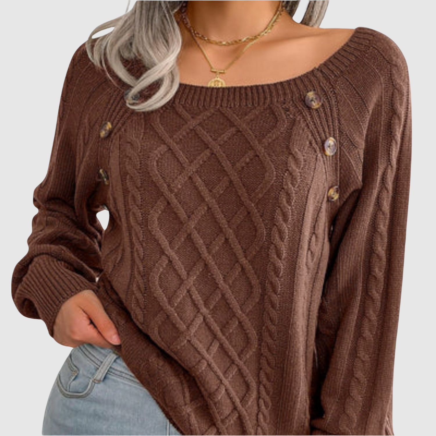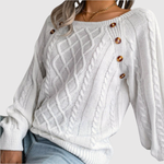 Tento pulovr kombinuje klasické kabelové pletení s moderními detaily v podobě dekorativních knoflíků na rameni. Měkký materiál zajišťuje vysoký komfort, zatímco design ho činí zároveň nadčasovým a elegantním.