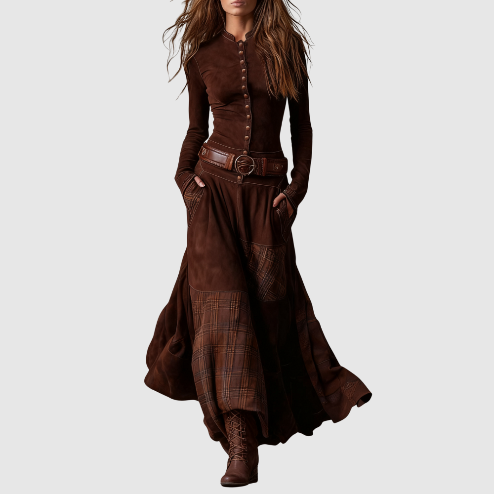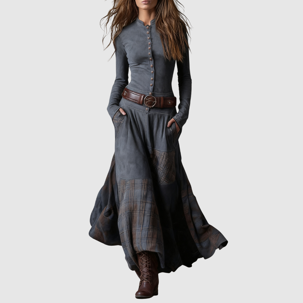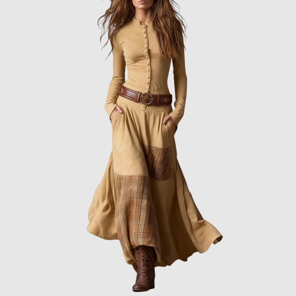 Toto dlouhé boho šaty kombinují elegantní střih s jemnými vintage detaily. Široká sukně dodává každému kroku pohyb a lehkost. Výrazný pásek zdůrazňuje pas a vytváří krásnou ženskou siluetu.