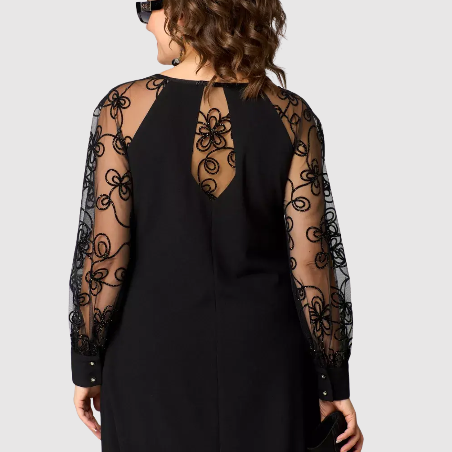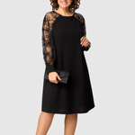 Lehké šaty v A-čkovém střihu, které spojují čisté linie s jemnými krajkovými detaily. Průsvitné rukávy dodávají šatům ženský nádech, zatímco volná silueta krásně padá a zvýrazňuje postavu. Ideální volba pro každodenní eleganci i formální události.